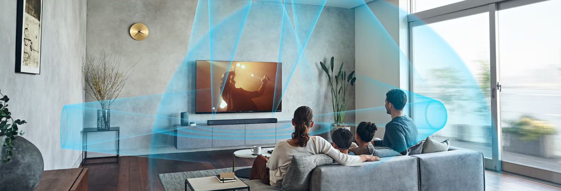 Feel a helicopter fly overhead, rain fall across the room, or footsteps approach from behind—every sound has direction and depth with a multi-speaker set up or a simple soundbar for tight spaces.